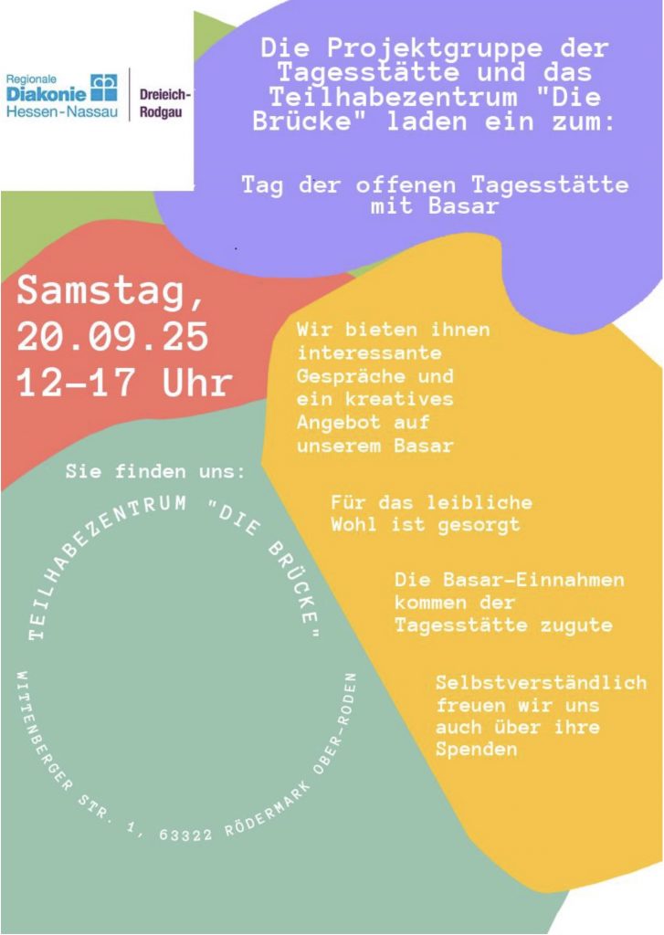 Heute leiten wir gerne diese Einladung zum „Tag der offenen Tagesstätte/des Teilhabezentrum „Die Brücke“ in Ober-Roden für Samstag, 20.09.25 weiter!