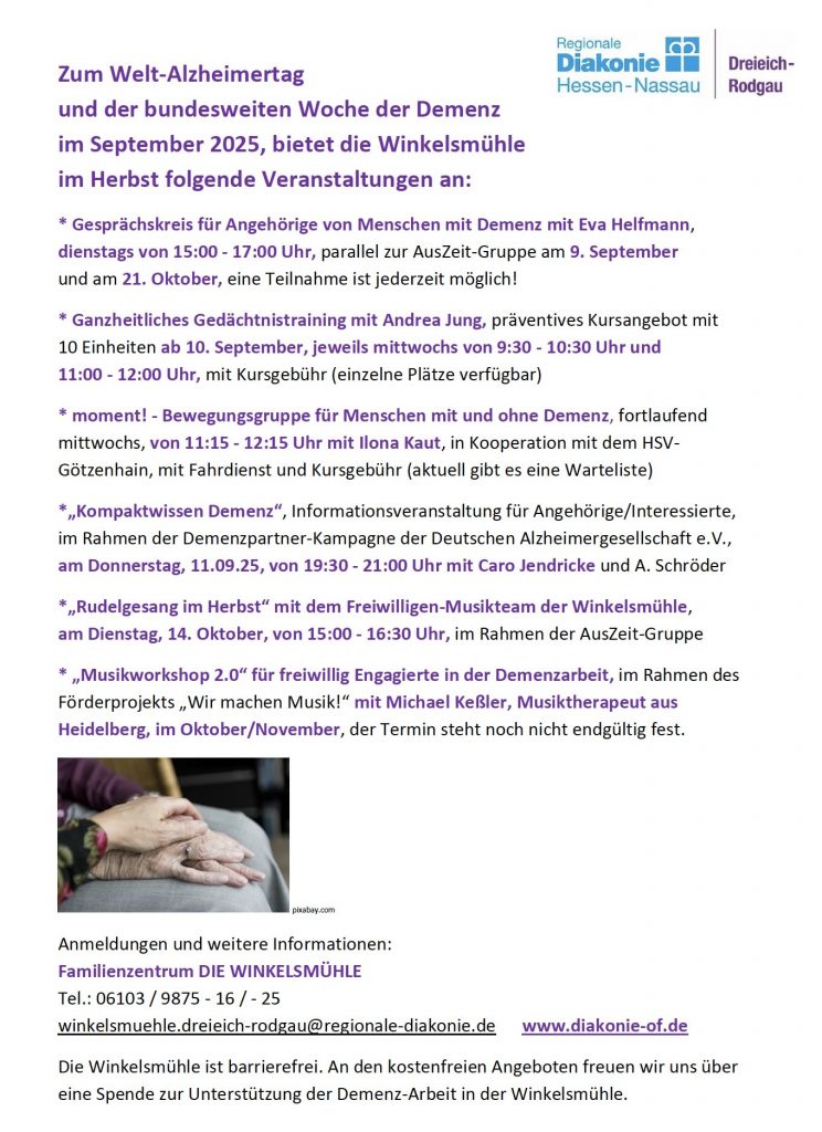 Im Hinblick auf den Welt-Alzheimertag und die bundesweite Woche der Demenz im September 2025, haben wir im Herbst folgende Veranstaltungen im Programm, auf die wir bereits heute im Überblick (siehe Daten und Details im Anhang) hinweisen möchten: