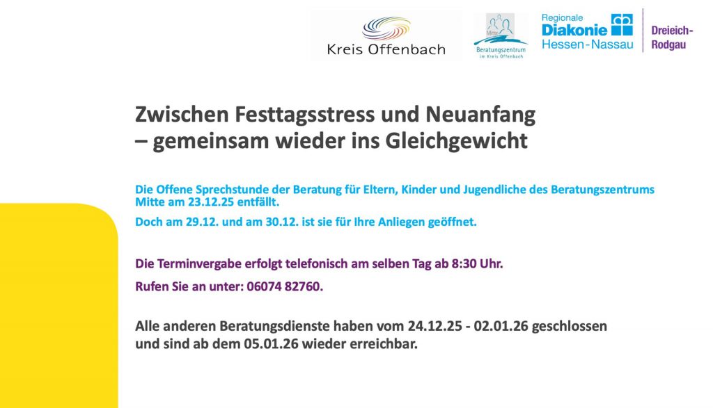 Die Offene Sprechstunde der Beratung für Eltern, Kinder und Jugendliche des Beratungszentrums Mitte am 23.12.25 entfällt.